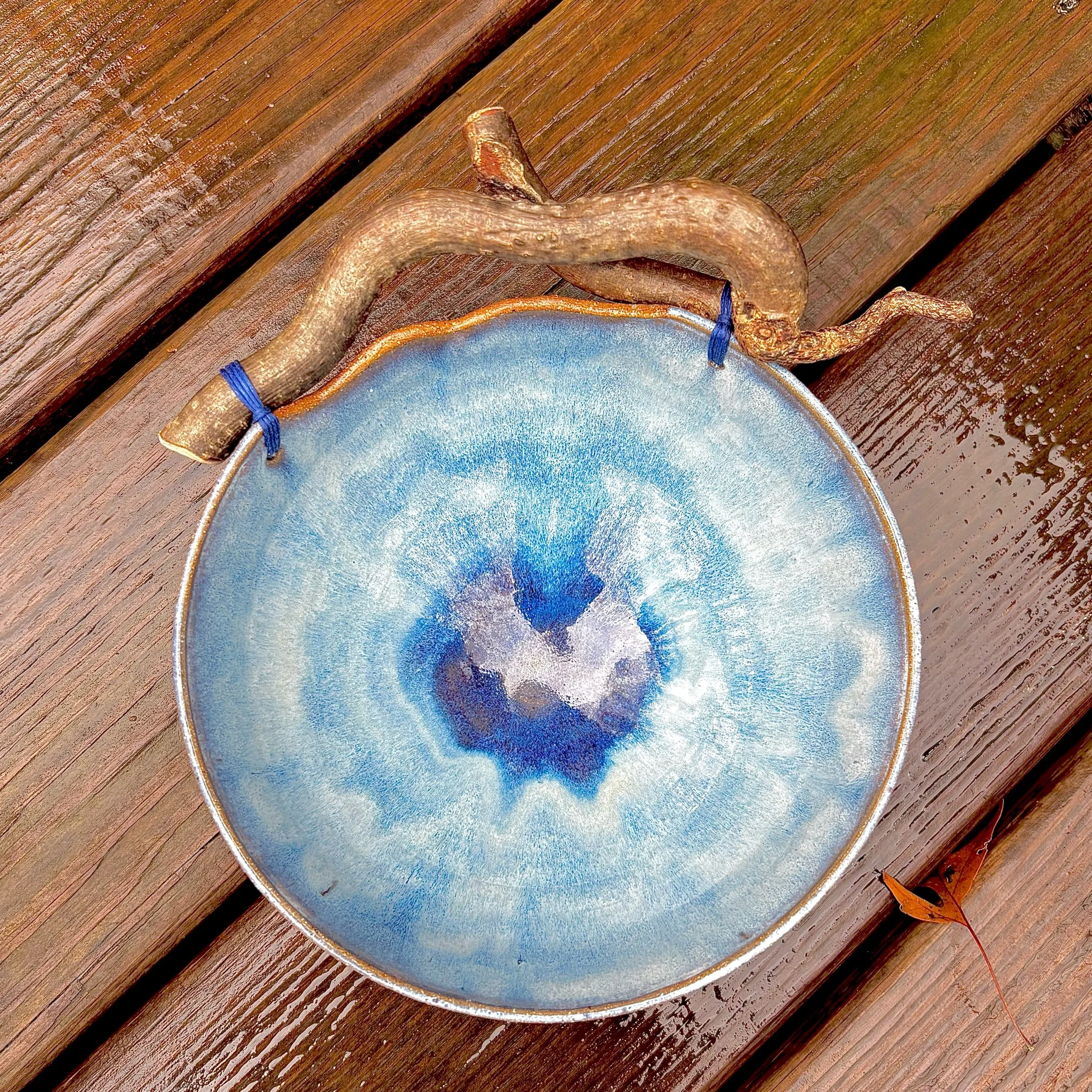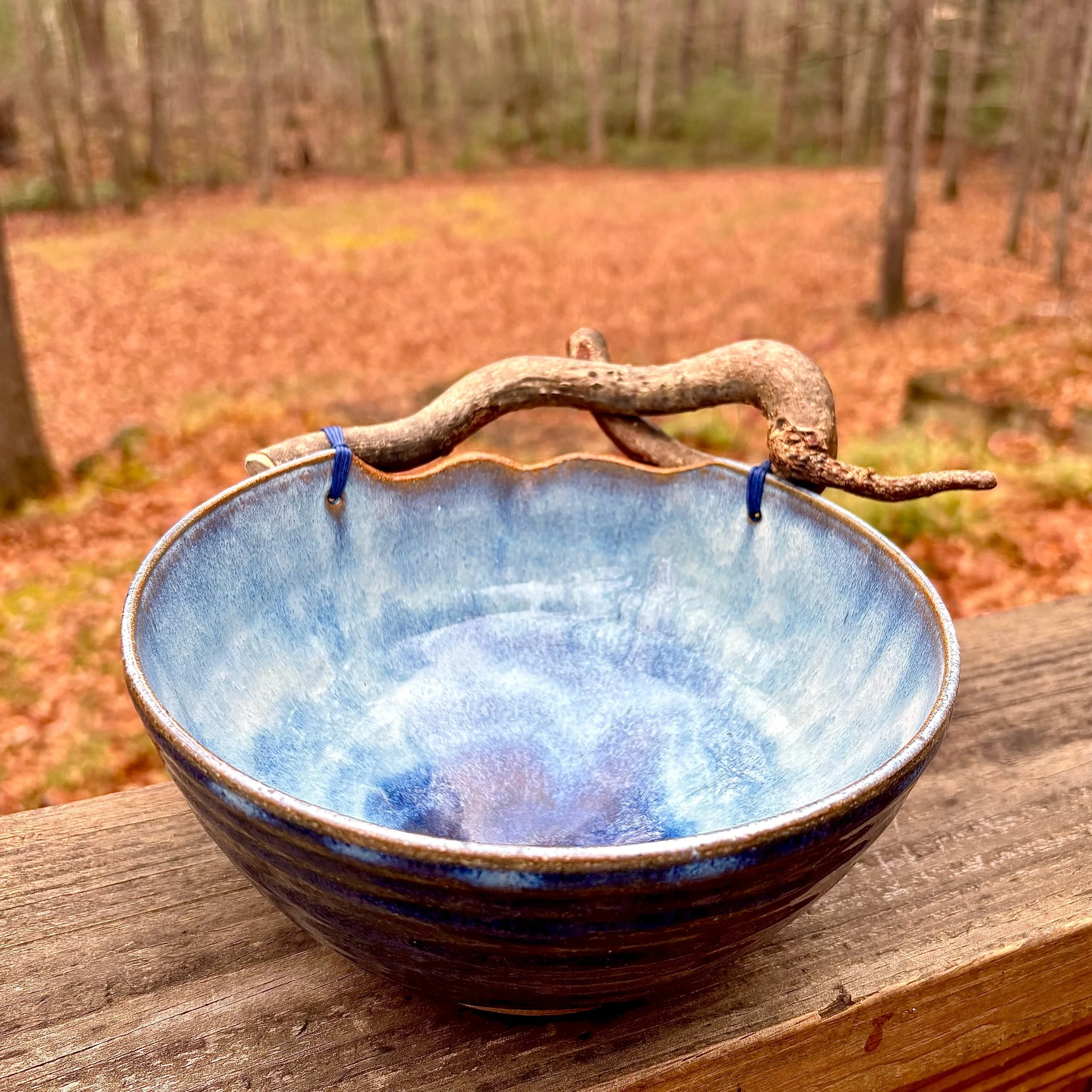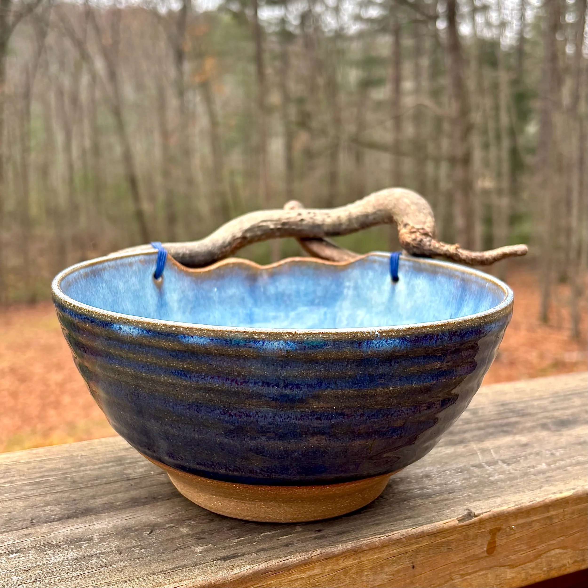 Mesmerizing shades of blue drench this serving piece. A twisted branch handle adds utility and style to the sandy stoneware at the base.