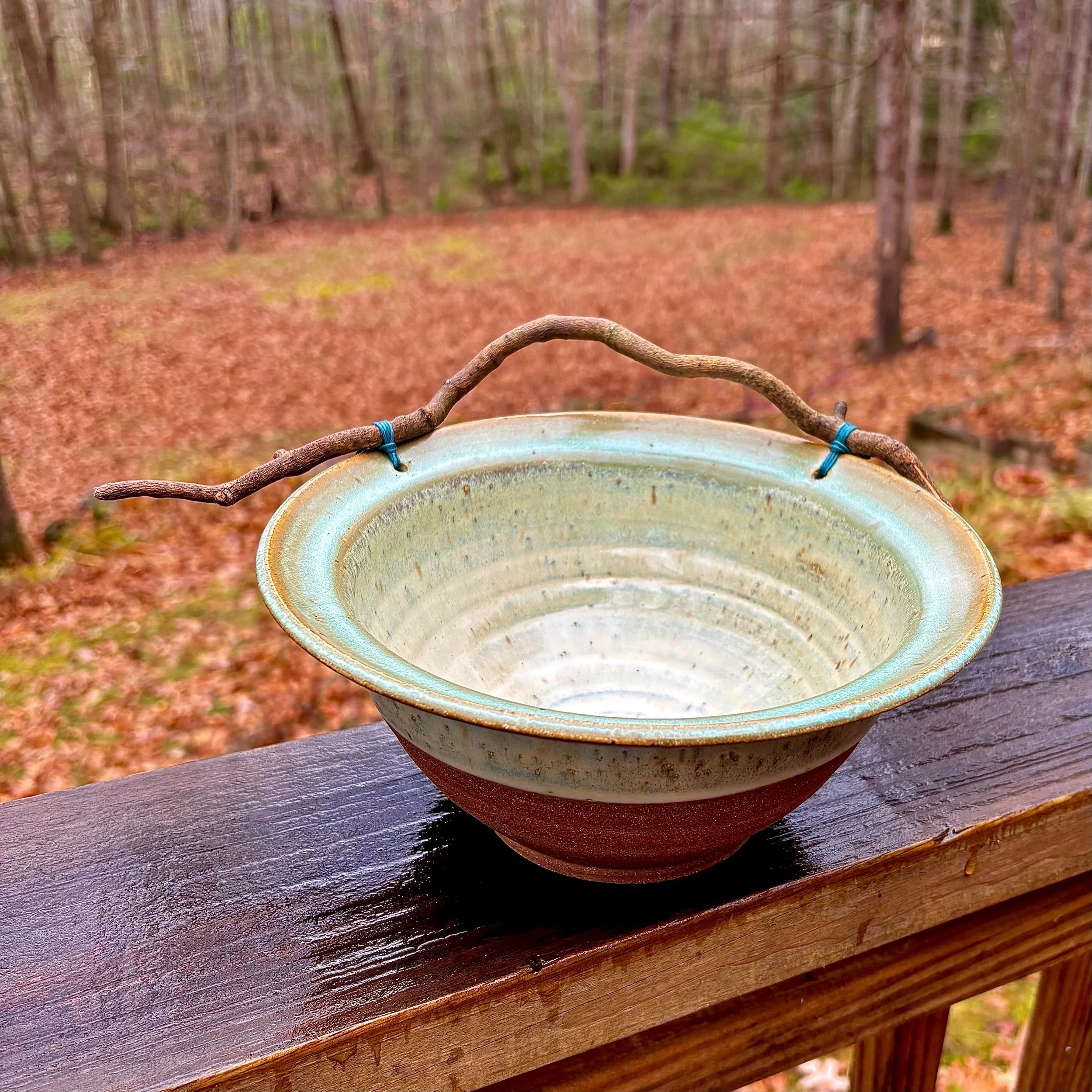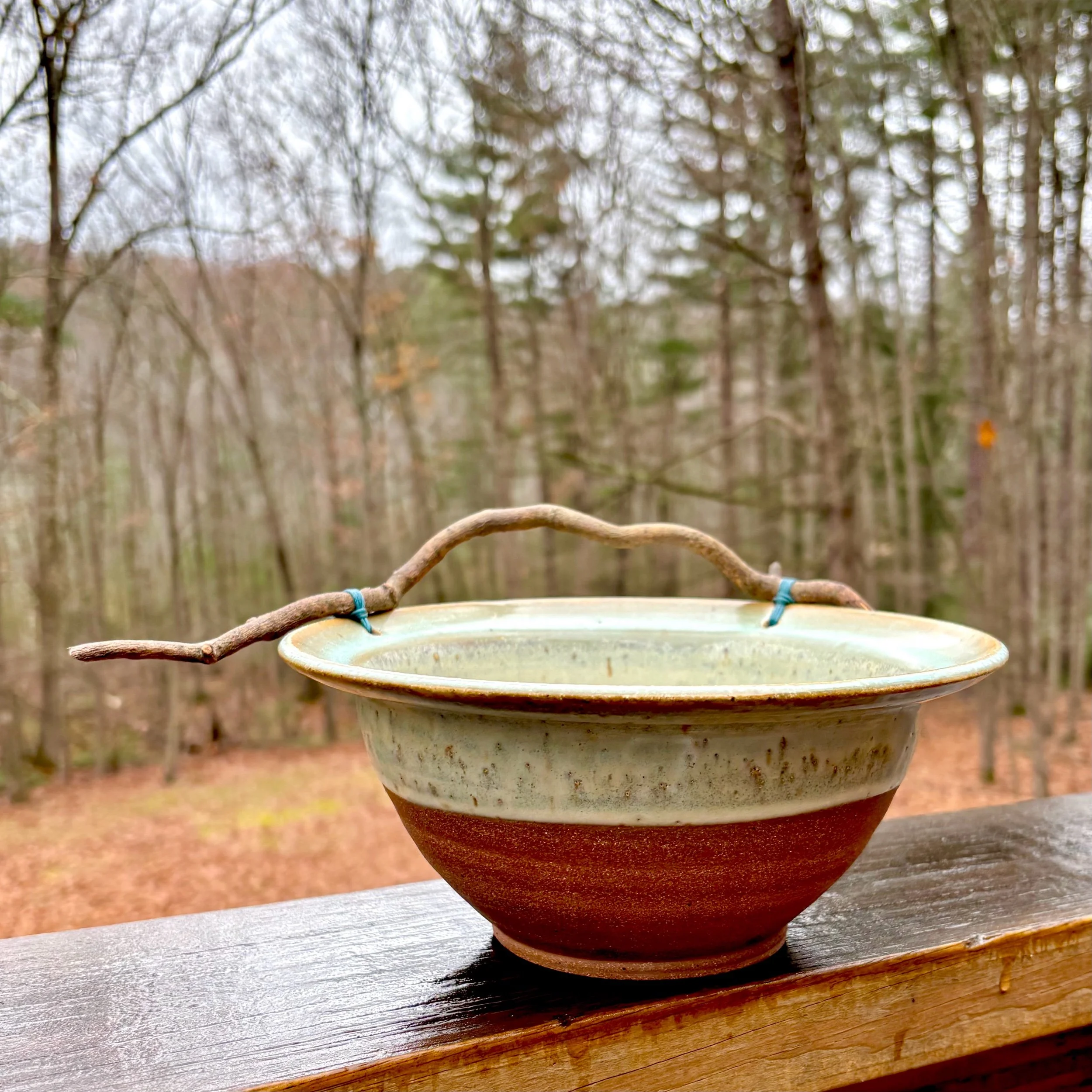 A graceful branch accents this serving bowl, in delicate shades of ivory and light turquoise. A rich red stoneware, left partially unglazed on the exterior for a warm, earthy feel.